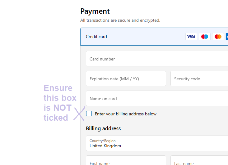 Having trouble checking out? Make sure the tick box isn't selected after entering your card details - then enter your billing address.