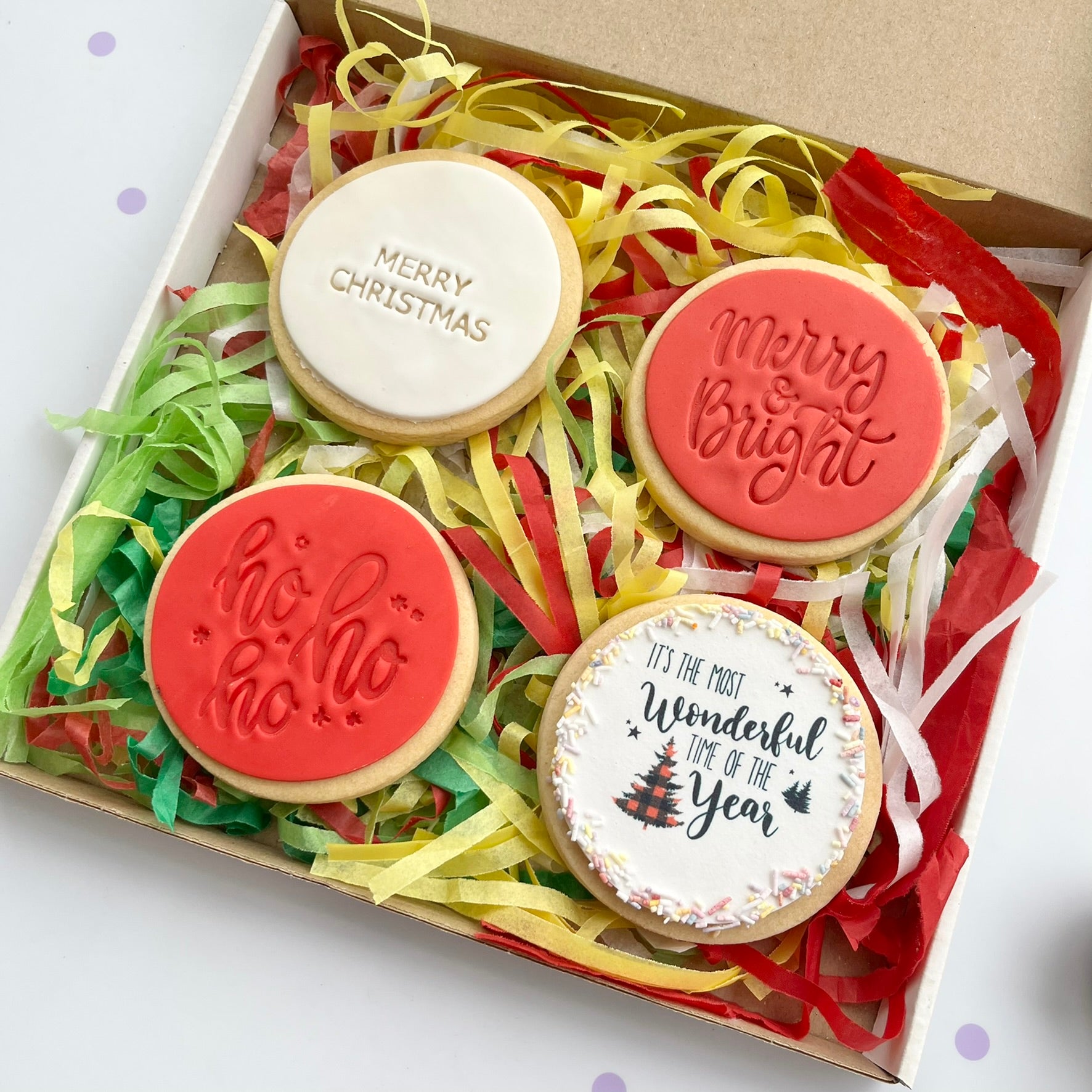 Cookies come in a set of 4, individually wrapped in a gift box with festive tissue paper